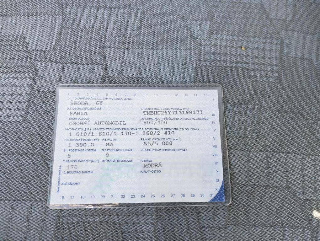 Osobní automobil Škoda Fabia, 1.4i, 55 kW, RZ 5AP2717, 2001, stav tachometru 286.897 km