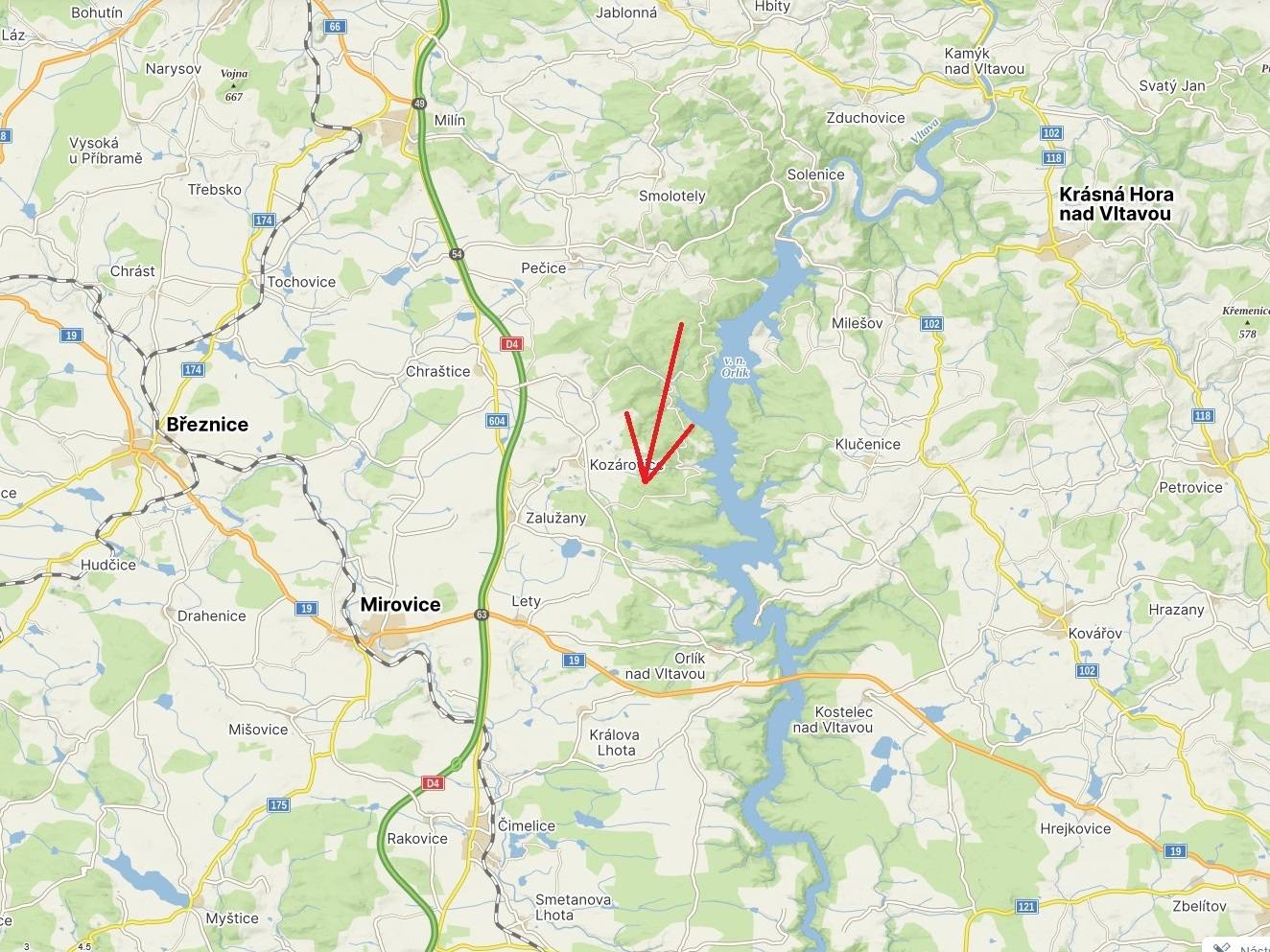 Prodej souboru 8 lesních pozemků o celkové výměře 40.085 m2. Pozemky se nacházejí v obci Kozárovice (okres Příbram), ve dvou katastrálních územích - k.ú. Vystrkov a k.ú. Kozárovice. Lesní pozemky se nacházejí ve vyhledávané rekreační oblasti v těsné blízkosti vodní nádrže Orlík. V katastru nemovitostí jsou všechny pozemky vedeny jako lesní pozemek. Celková výměra všech pozemků činí 40.085 m2