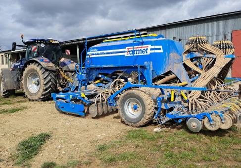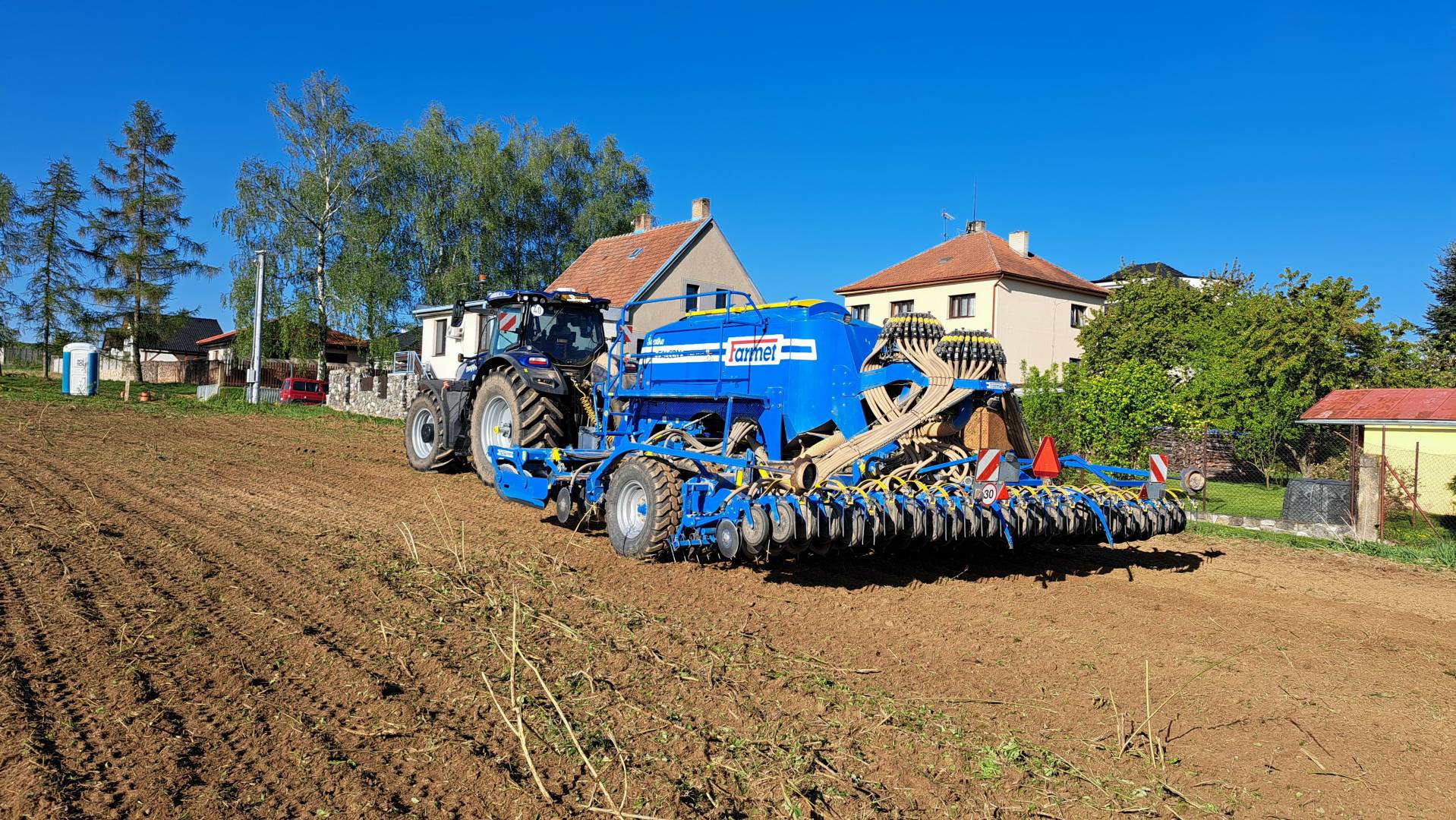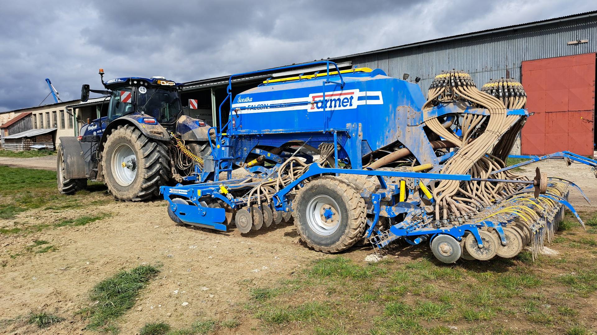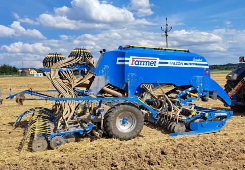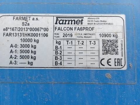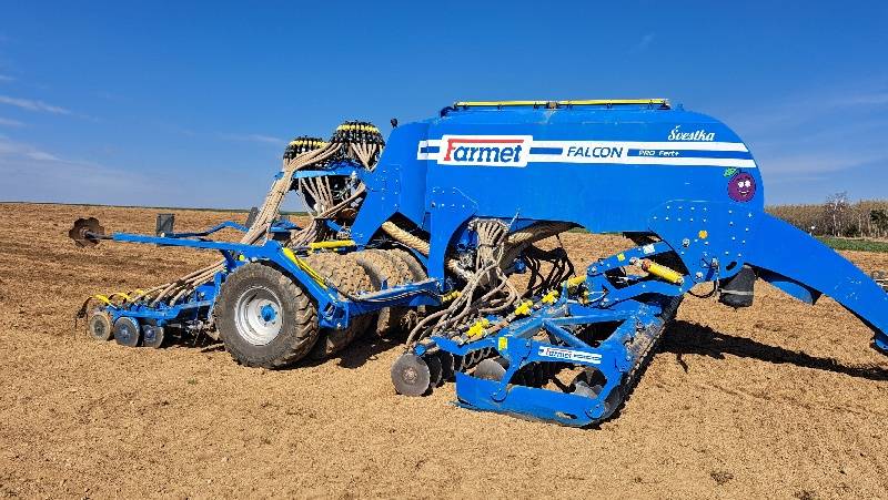 Farmet Falcon 6 PRO Fert+, ramena TBZ kat. 3, předzpracující 2-řadá disková sekce + přihnojovací disková sekce (24 přihnojovacích botek pod patu na rozteč 250 mm), pneumatikový válec s industriálním vzorem, čističe kol válce, zavlačování za válcem, zadní dvoudisková secí sekce (48 botek na rozteč 125 mm), 2 dávkovače osiva (systém výměny válečků), 2 rozdělovací hlavy, dvoukomorový zásobník osiva – umožňuje setí dvou plodin sudými a lichými botkami, objem zásobníku 6000 l, Section Control – řízení každé botky samostatně, systém snímání výsevu + 48 ks snímačů průletu osiva, preemergentní značkovač – 3 držáky na každé straně pro různé rozchody kol postřikovačů, ventilátor – hydraulicky regulovaný okruhem traktoru, ISO-BUS připojení na monitor v traktoru, hydraulicky ovládané znamenáky, pracovní osvětlení stroje, vnitřní osvětlení násypky, senzory hladiny osiva a hnojiva, adaptér pro přefuk osiva z násypky pro hnojivo do násypky po osivo, maxinásypka až na 5000 kg osiva, prohlášení o shodě, technické osvědčení, návod k obsluze, katalog náhradních dílů, stav počítadla: cca 1010 ha, nové obutí secích disků – odpracováno cca 100 ha.
