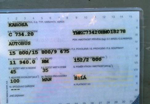 Prodej autobusu zn. KAROSA, typ C 734.20, objem motoru 11.940ccm, výkon 152kW, stav tacho: neznámý. Odpočet DPH není možný.